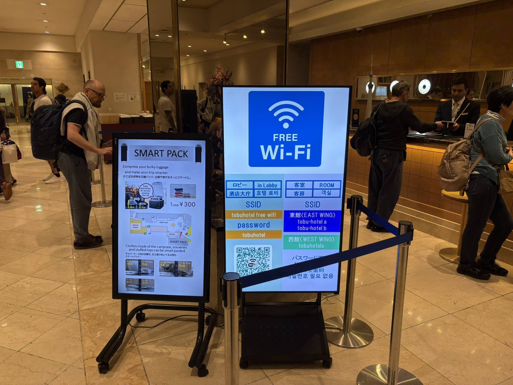 フロントには施設の案内表示(電光掲示板)があり、英語や中国語、韓国語でも案内されていました。
