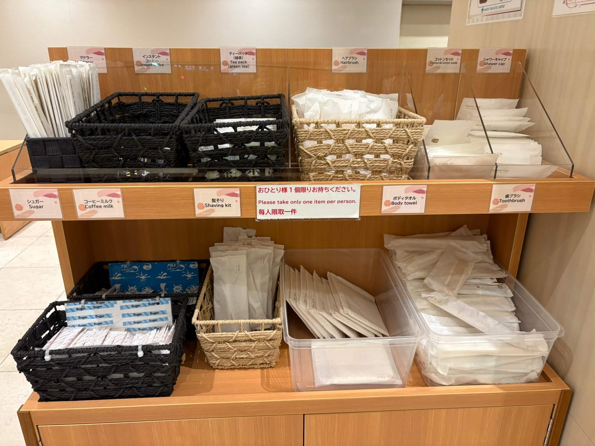 お茶セット(インスタントコーヒー、砂糖、ミルク、緑茶ティーバッグ)、歯ブラシ、ボディタオル、髭剃り、ヘアブラシ、シャワーキャップ、コットンセットはロビーにあるアメニティコーナーから必要なモノを持って行くシステムです。(1人1個限り)