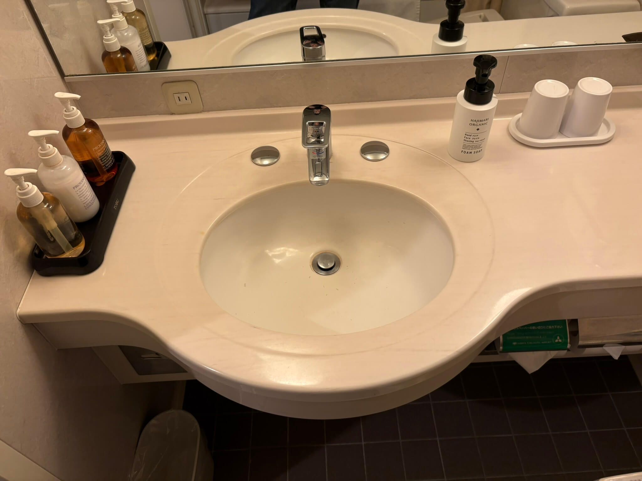 シャンプー・コンディショナー・ボディーソープが洗面ボールの横に配置されているのは不思議でした。(お風呂で使うものなのに…)