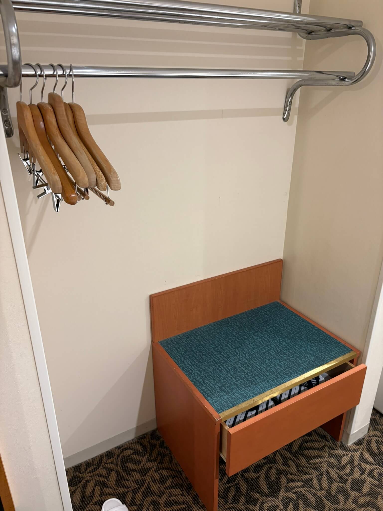 クローゼット(ハンガーとハンガー掛け)と荷物置き場があり、手狭に感じることはありませんでした。