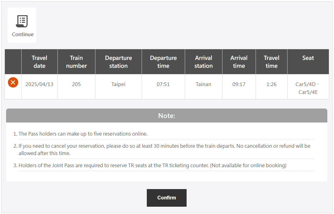その際、座席指定した列車の情報も台湾高鉄周遊券(3日パス)に反映されます。