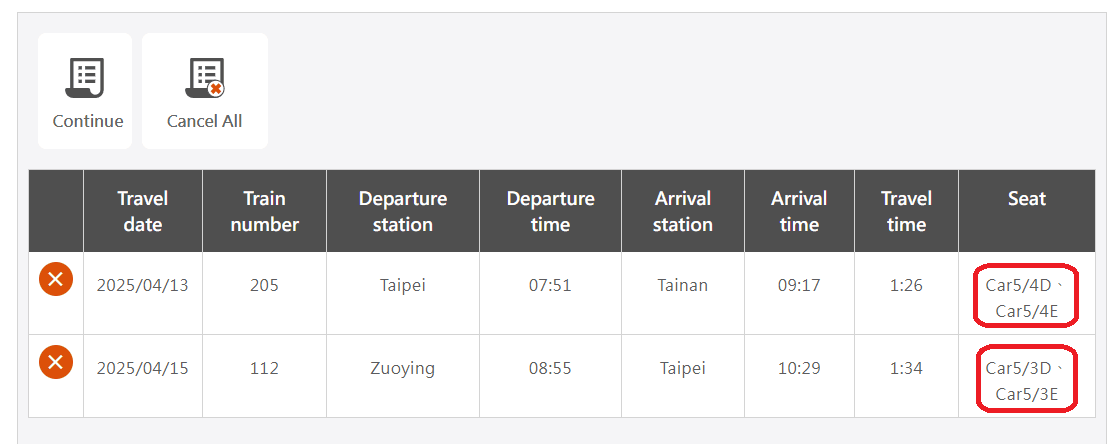 実際私たちはこの方法で往路(台北→台南)も復路(左営(高雄)→台北)も2名並び席を確保することが出来ました!