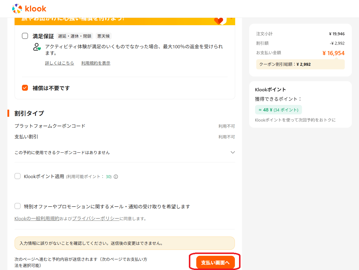 必要事項を全て入力したら「支払画面へ」をクリックします。